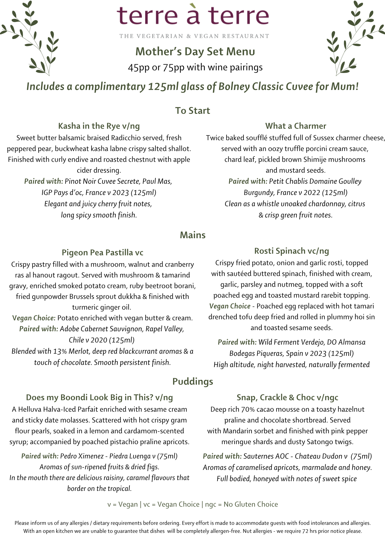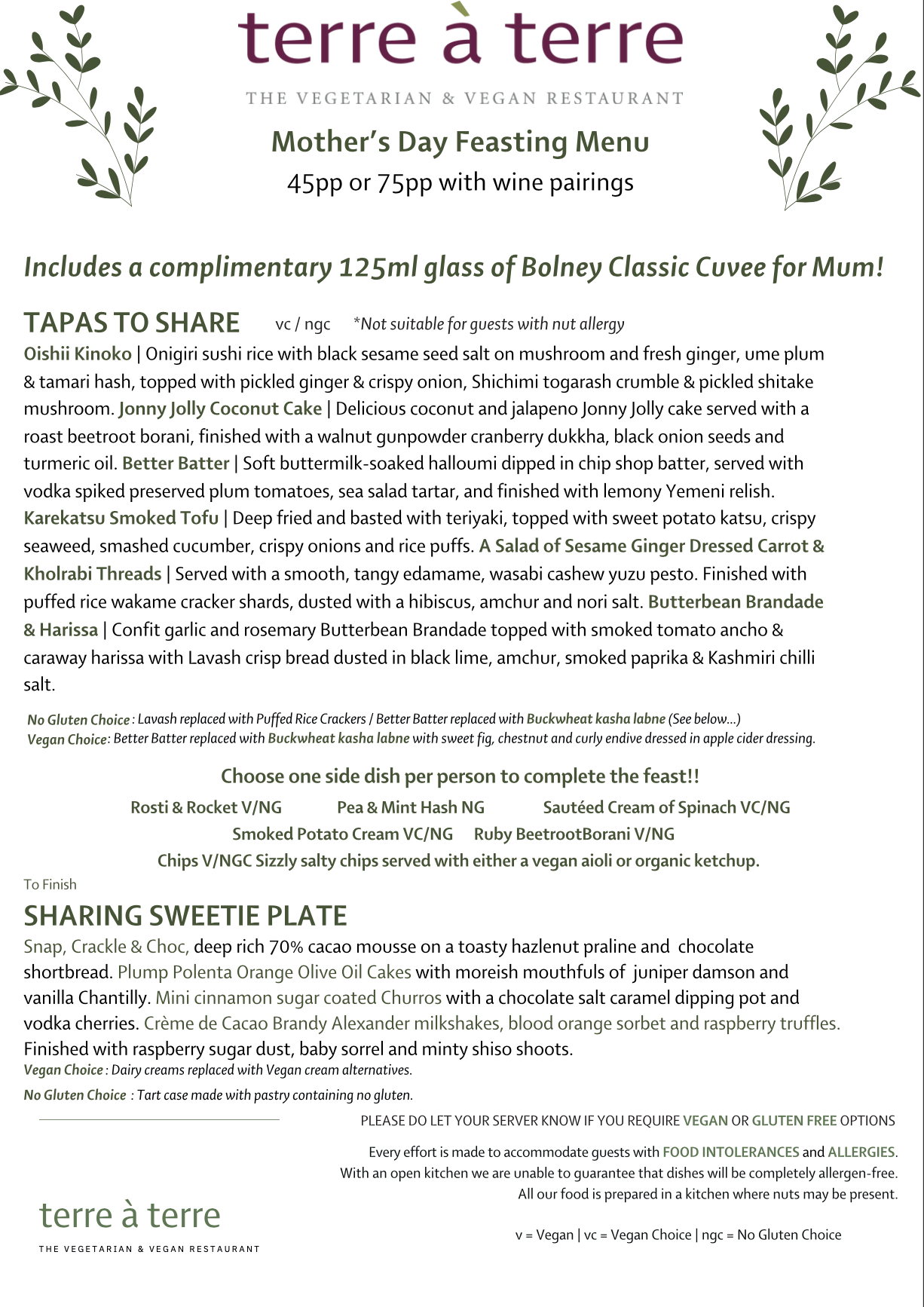 Join us in celebrating Mother’s Day at terre à terre on Sunday 15th March.